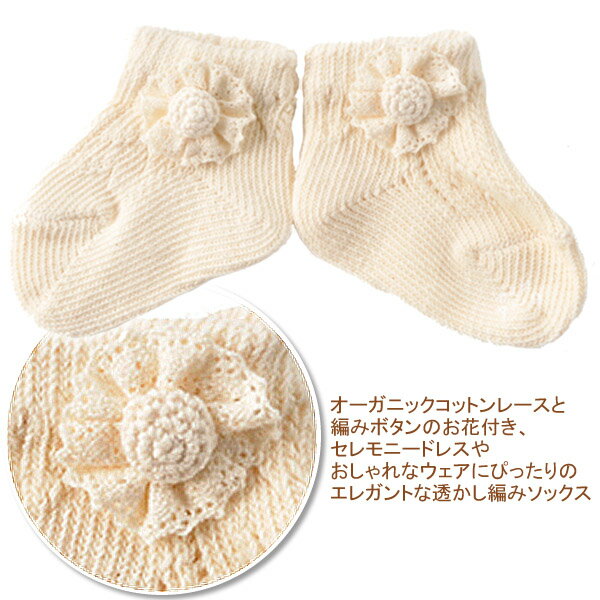 オーガニックコットンレースと編みボタンのお花付き、セレモニードレスやおしゃれなウェアにぴったりのエレガントな透かし編みソックス。